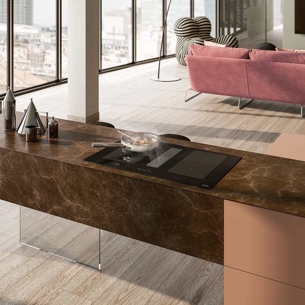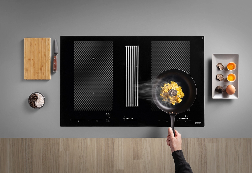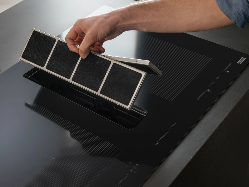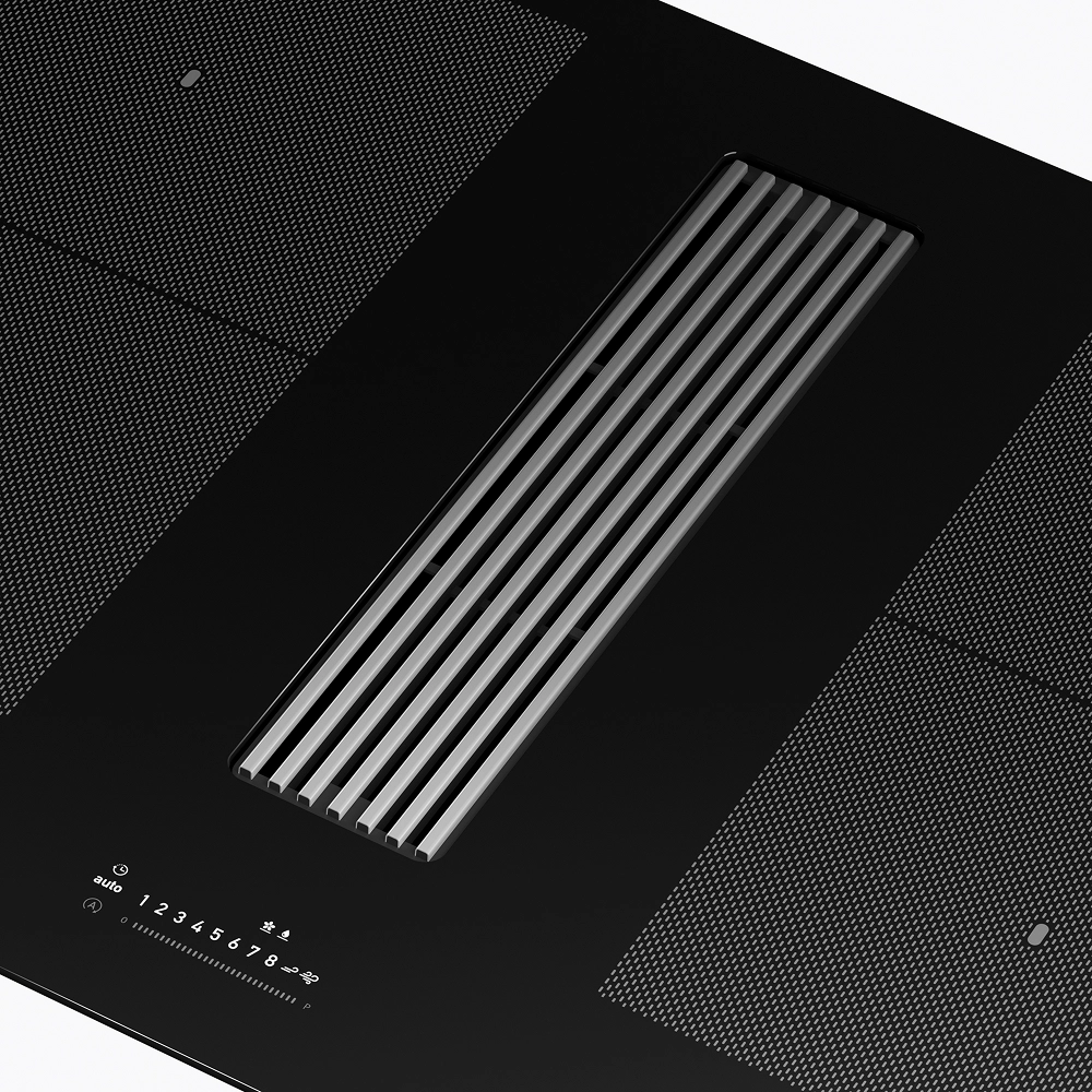 Воздуховод вытяжки находится на одном уровне с поверхностью панели, что позволяет передвигать посуду без необходимости её поднимать.